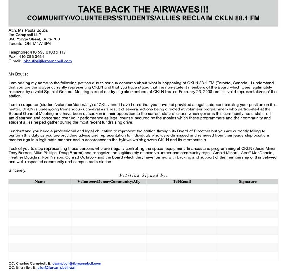 The non-student members of the Board have also said that they – not he Board, but they themselves – received a ‘legal opinion on the process used to call the “Special Meeting” as well as the reasons stated as “just cause” for removing certain Board members and the management staff.’ We have asked for that opinion. We have not received it. Counsel for CKLN is Paula Boutis, of Iler Campbell. She has refused to give us a copy of the legal opinion. Furthermore, she says she is ‘not obligated or permitted to provide us with [the] opinion’.