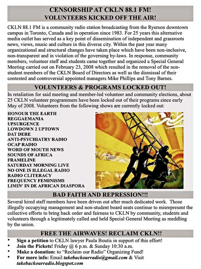 We have heard about the meeting. In our opinion, it is not legitimate called; the people who called it have no authority to do so. Decisions taken at it are invalid, in our opinion. We will be writing a memo to the former Board members, including the former senior management staff, stating that their actions are not legitimate and that any decisions that flow from that meeting are invalid. Note that, even if it were called by people who authority to do so, the By-law clearly states who can attend CKLN meetings: volunteers, staff, students and community members may attend. The By-law does not allow anyone to pick and choose who can attend. We also urge anyone who attends that meeting to ask the following questions: “Why is this meeting legitimate? On the basis of whose opinion? Is there a legal opinion on that? If so, to whom was the legal opinion given? What does it say?
