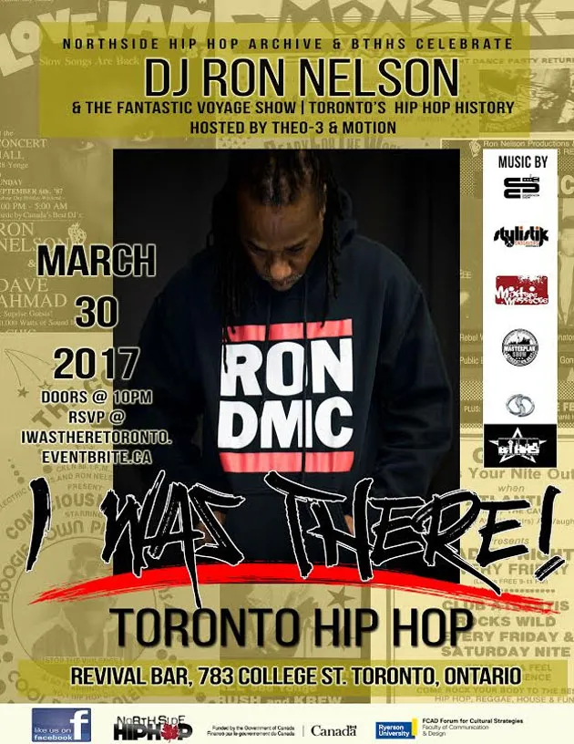 Hosted by: Northside Hip Hop Archive & the Bigger Than Hip Hop Show (BTHHS) — Join us in Toronto as we document Canadian hip hop and party at “I Was There!”—a national archiving initiative organized by Northside Hip Hop Archive. We will be celebrating DJ Ron Nelson’s & The Fantastic Voyage’s contribution to hip hop culture with:– A party on March 30th @ Revival (doors open at 10pm); – A one day symposium on March 31st @ 11am, at Allan Slaight Radio Institute (Ryerson University, 80 Gould Street, Toronto, ON) to discuss hip hop radio in Toronto, with a keynote address by DJ Ron Nelson.