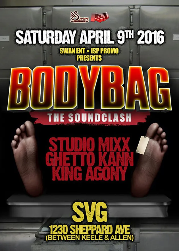 Congratulations to Ghetto Khan, winners of the Bodybag Soundclash held at SVG Lounge (1230 Sheppard Ave. W., Toronto) last Saturday April 9th featuring winners Ghetto Khan vs Studio Mixx Sound vs King Agony.  Ghetto Khan not only won the event, they also won every single round, and only had to participate in the chune-fi-chune because of the event’s point/scoring system where Ghetto Khan needed 10 points total in order to win (they had earned 6 points/2 points were awarded for each of 3 winning rounds) and could only earn these additional 4 points by participating in the chune-fi-chune. This of course, would be good for the fans, but a possible nightmare for Ghetto Khan, should they suffer a T.K.O and flop in this final saga after already winning every Round in the clash.  Fortunately for Ghetto Khan and the promoters, this saga would not play out, and Ghetto Khan dominated in the chune-fi-chune Round just as they had done in the clash’s first 3 rounds, dominating their competition with what can only be described as an “easy walkover”.