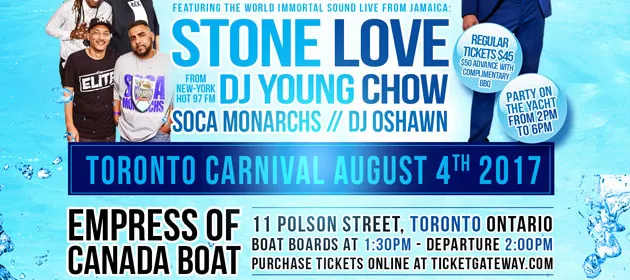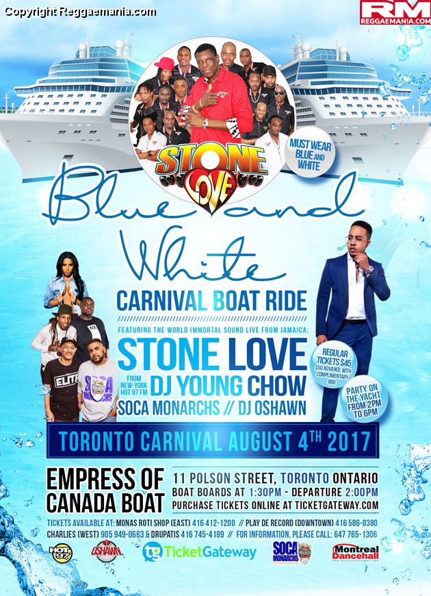 The STONE LOVE Blue & White Carnival Boat Ride aboard the Empress of Canada was a sell-off Friday August 4th.  The Boat left at 2:30 and returned at 5:30, and despite rain in the forecast, the cruise only saw intermittent periods of showers that didn’t stop anyone from partying.  The crowd there enjoyed two floors and two sound systems (Stonelove played top deck) and essentially two simultaneous parties offering Soca and Reggae for the massive.  What can I say, a great party and everyone had a good time, no complaints about the food, the boat, the ride, or the entertainment.  Sorry for those who missed the boat, better luck next year when I’m sure these promoters will do it again!