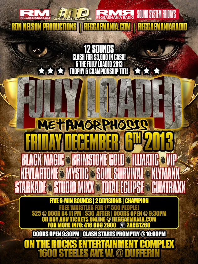 Congratulations to the new 2013 Fully Loaded Champions!!! Klymaxx. Here is a Sound that is on the rise – I personally would like to congratulate them on this victory, which will be significant in the long run, as every Fully Loaded champion has gone on to make noise in the industry. Klymaxx will be invited to play on Sound System Fridays next Friday December 20th an we can celebrate their victory all over again. For those who missed the clash, things ran smooth partly because of the lack of hitching due to a judging sytem being in place. Thanks also to Jill and Skully for my Soundclash Lifetime Achievement Award trophy, although you gotta exchange it for a new one casue they spelled “reggae” wrong LOL. Thanks to everyone who helped, supported and participated in Fully Loaded Metamorphosis 2013, and once again, congratulations to Klymaxx for their victory, won by dubs, speech, strategies, and brains!