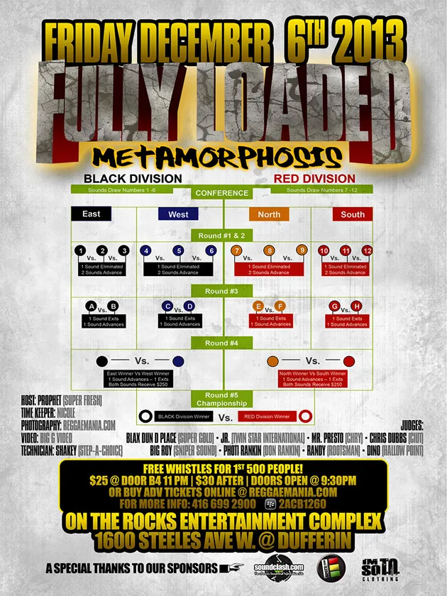 Dooglemyer Productions, CharShay hair Creations & Total Eclipse Ent Present King of the Ring Championship Final . Friday December 13th @ The Milan Banquet Hall . 1989 Dundas St. E.,, Mississauga (W. of Hgw #27) featuring the 3 Finalists: . Cumtraxx vs Klymaxx vs Super Gold . Clash starts 10pm Sharp . 4 x 20-min Rounds | 3rd Round 1 Sound Eliminated . Dub Fi Dub | No Playbacks | No Retreat | No Surrender . The winner receives a trophy & $1200 Cash Prize . Hosted by Tash Rozez & Ron Nelson . Timekeeper: Michie Promo . Adm $20 advance | $25 @ Door . info: 416.786.6771