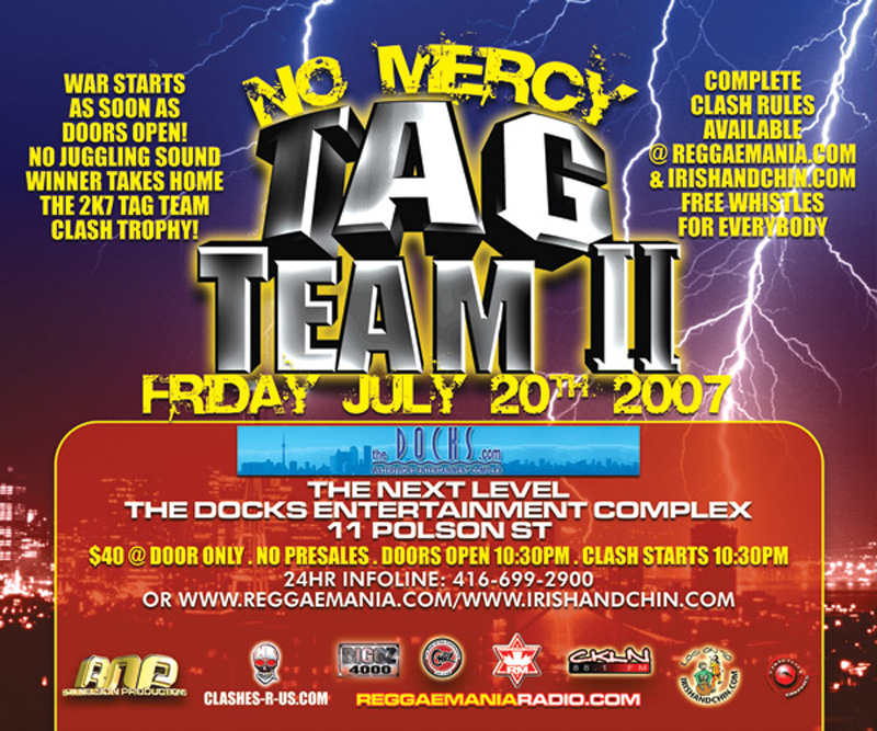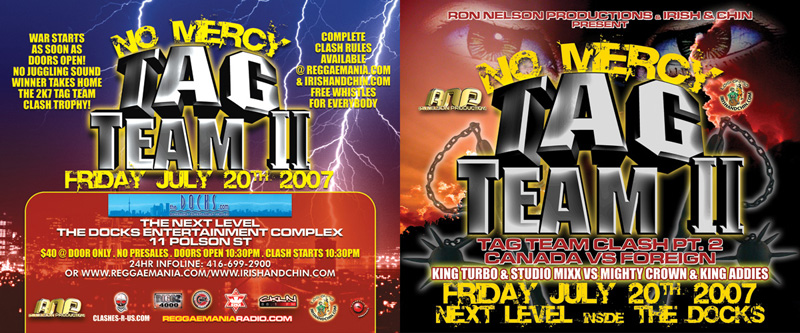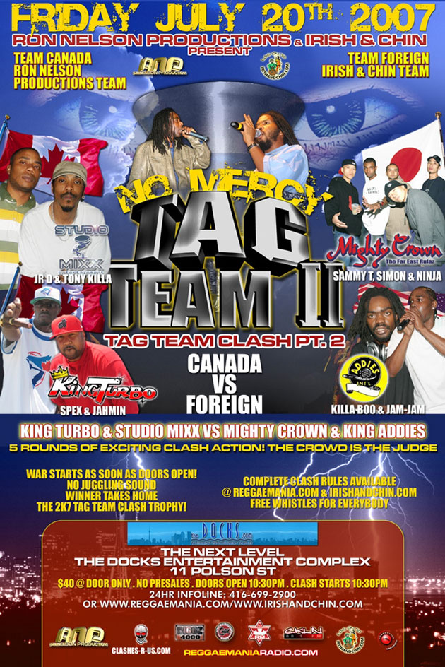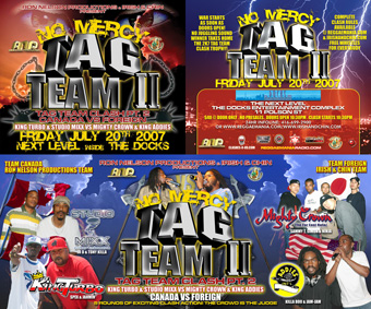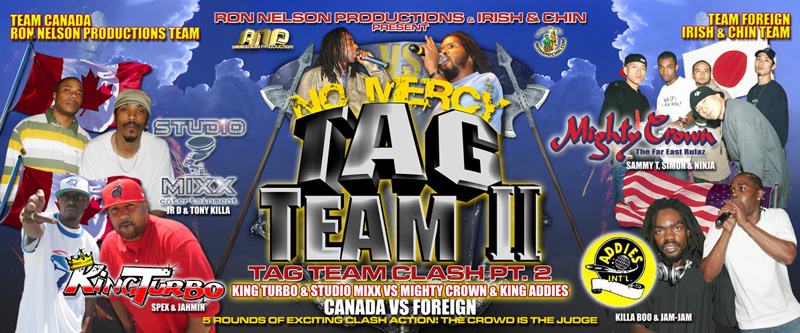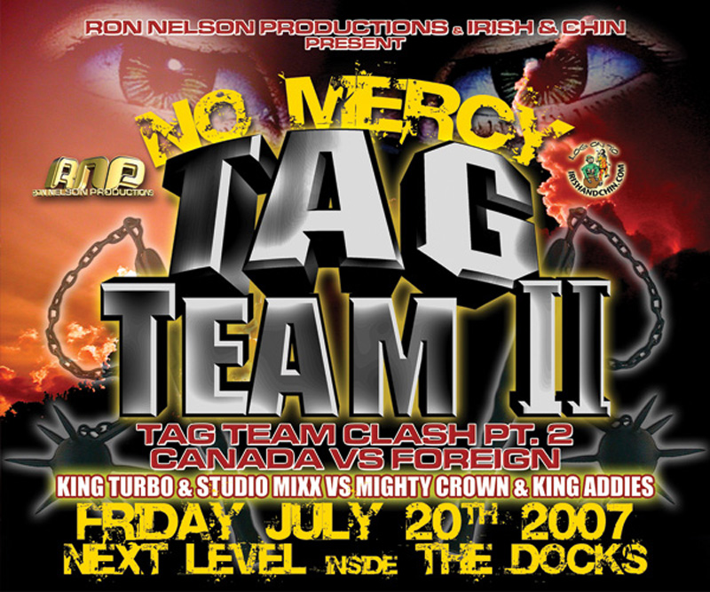 See the complete Ron Nelson Productions NO MERCY TAG TEAM CLASH II Video [4 hrs +] featuring TEAM CANADA (King Turbo + Studio Mixx) vs TEAM FOREIGN (Mighty Crown + King Addies) @ The Docks 07/20/07