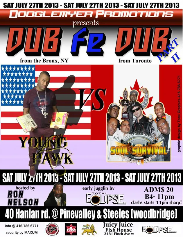See Hot Pics — Dooglemyer Promotions Presents Dub Fi Dub @ 40 Hanlan Rd (Woodbridge) 07.27.13. Early Juggling by Eclipse Sound . Host/Referee: Ron Nelson . No Rules, No Elimination . 4 x 20 Min Rounds . Dub fe Dub if Necessary . Half Time $300 Showdown . Dan Dan vs Jah Youth | Clash Starts 11pm Sharp! | Admission $20 b4 11pm . Tickets @ 2Lined Music Hut (Malvern Plaza) & Treajah Isle Records (Eglinton/Marlee) info: 416.786.6771