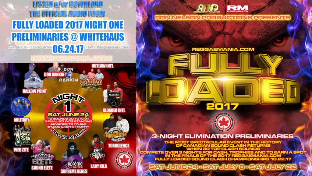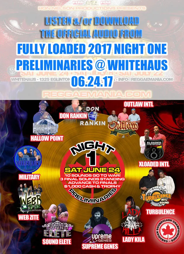 Listen &/or Download Night One of the ReggaeMania.com Fully Loaded Sound Clash Eliminations 06.24.17. Part One of this spectacular 3-night Ron Nelson Production event took place inside Mississauga’s Whitehaus and featured Don Rankin, X-Loaded, Webzites, Outlaw, Military, Turbalance, Hallow Point, Sound Elite, and Supreme Genes clashing for the Night One Trophy and a cool $1,000 Cash. The top 3 Sounds from Night One, Two and Three, along with a 10th ‘wildcard’ sound (based on points awarded by judges) live to Clash again on Saturday October 21st 2017 at the Fully Loaded Finals.