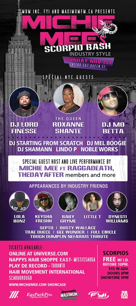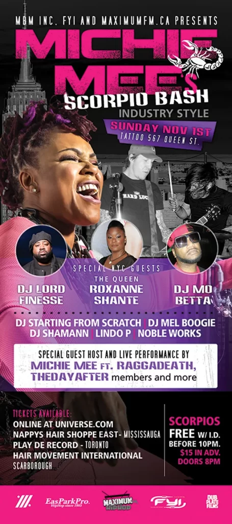 Michie Mee’s Scorpio Bash ‘Industry Style’, happening Sunday November 1st. NYC INVADES TORONTO once again with very special guests, The Queen – Roxanne Shante , Dj Lord Finesse, Dj Mo Betta (Michie Mee’s original dancer on First Priority Records) sure to rock the house + LIVE performance by Michie Mee ft Raggadeath and The DayAfter members  + Special Invited Icons.