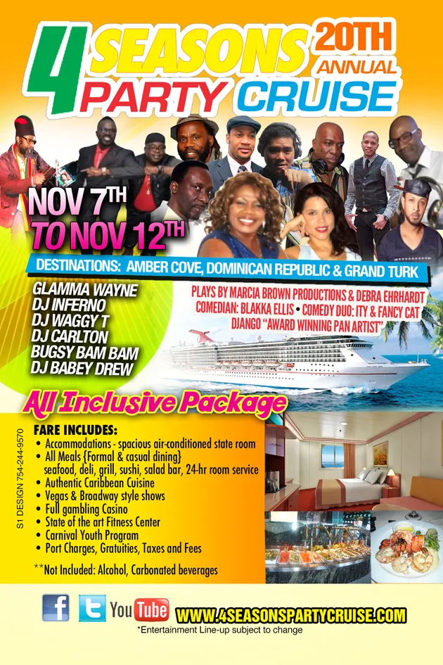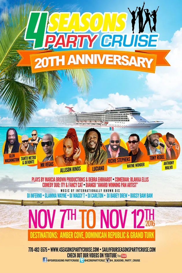 The 4 Seasons Party Cruise 20th Anniversary Edition–November 7th to 12th/2016 featuring Alison Hinds, Luciano, Mr. Vegas, Tony Rebel, Richie Stephens, Glen Washington, Anthony Malvo, Wayne Wonder, Tanto Metro and Devonte, + Top International DJ’s! Bookings: 770.482.5575 or www.4seasonspartycruise.com